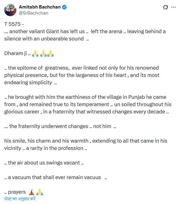 Dharmendra Death: बॉलीवुड के दिग्गज एक्टर धर्मेंद्र का 24 नवंबर को निधन हो गया है. जिसके बाद फिल्म इंडस्ट्री में सन्नाटा फैल गया. जिसके बाद एक-एक करके बड़े से बड़े सितारे और धर्मेंद्र के अंतिम संस्कार पर पहुंचे. अमिताभ बच्चन, सलीम खान, सलमान खान, आमिर अक्षय हर किसी के चेहरे पर धर्मेंद्र से आखिर बार मिलते हुए खालीपन नजर आया. साथ कई सेलेब्स ने धर्मेंद्र के जाने का दुःख जताते हुए पोस्ट शेयर किया. इस बीच सोशल मीडिया पर अमिताभ ने धर्मेंद्र के लिए पोस्ट कर दुःख जताया है.