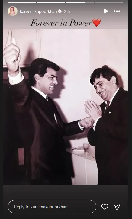 बॉलीवुड एक्ट्रेस करीना कपूर भी धर्मेंद्र के निधन से टूट गई. करीना ने भी इंस्टाग्राम पर धर्मेंद्र की तस्वीर शेयर करते हुए लिखा कि इंडस्ट्री ने एक बेहद प्यारा और नेकदिल इंसान खो दिया है.