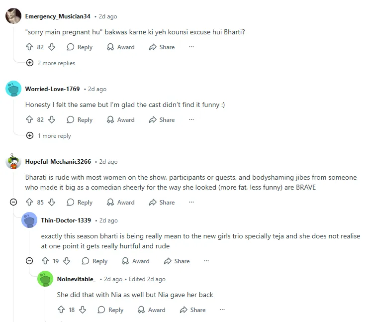 जैसे ही ये वीडियो वायरल हुआ, यूजर्स का गुस्सा भारती सिंह पर फुट पड़ा. कई लोगों ने इसे मजाक नहीं, बल्कि बॉडी शेमिंग करार दिया. रेडिट पर यूजर्स ने भारती को मीन और रूढ़ सोच वाला बताते हुए आलोचन की. कुछ लोगों ने ये भी आरोप लगाया कि, भारती अपने सेट पर फीमेल एक्ट्रेसेस के साथ भेदभाव करती हैं. इस पूरे मामले ने एक बार फिर टीवी शोज में सीमाओं और सम्मान को लेकर बहस छेड़ दी है.