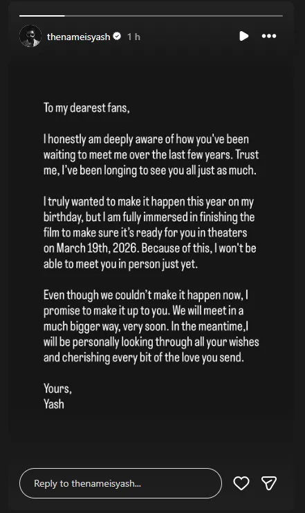 Happy Birthday Yash 👑@TheNameIsYashhttps://t.co/EOzZLZIXBi - Jan 08, 2026 16:01 IST