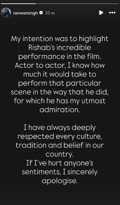 वहीं, अब रणवीर सिंह ने चुप्पी तोड़ी और सफाई देते हुए एक पोस्ट शेयर कर कहा, 'मेरा इरादा फिल्म में ऋषभ की जबरदस्त परफॉर्मेंस को हाइलाइट करना था. हर एक्टर को पता है कि उस सीन को जिस तरह से उन्होंने किया, उसे करने में कितना समय लगेगा, जिसके लिए मैं उनकी बहुत तारीफ करता हूं. मैंने हमेशा अपने देश की हर संस्कृति, परंपरा और विश्वास का बहुत सम्मान किया है. अगर मैंने किसी की भावनाओं को ठेस पहुंचाई है, तो मैं दिल से माफी मांगता हूं'