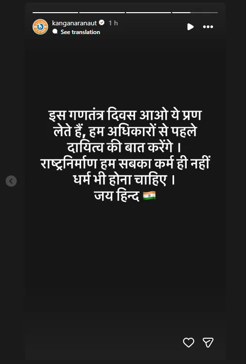 रिपब्लिक डे की ढेर सारी शुभकामनाएं देते हुए बॉलीवुड की क्वीन ने सोशल मीडिया पर कई स्टोरी लगाई और एक में तो एक्ट्रेस ने बहुत अच्छा सा मैसेज दिया है.