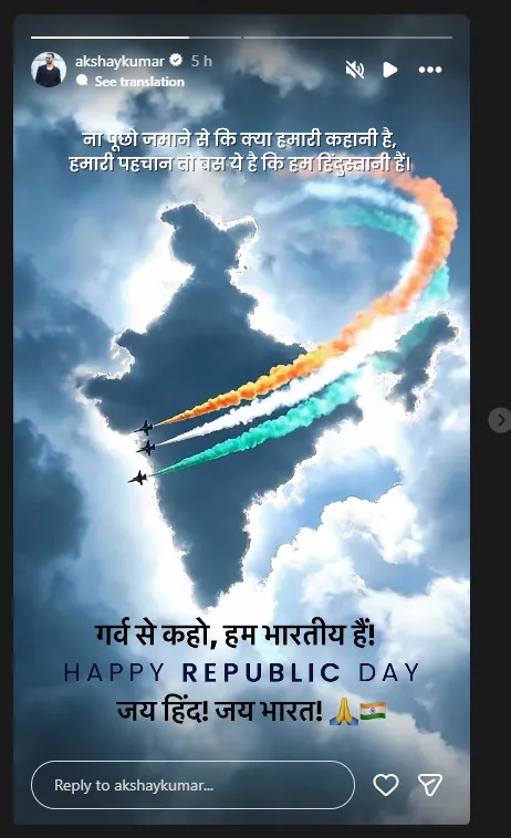 रिपब्लिक डे के इस खास अवसर पर बॉलीवुड एक्टर अक्षय कुमार ने सोशल मीडिया पर स्टोरी शेयर करते हुए फैंस को रिपब्लिक डे की शुभकामनाएं दी. एक्टर ने लिखा कि, 'गर्व से कहो, हम भारतीय हैं. हैप्पी रिपब्लिक डे 'जय हिंद जय भारत'.'