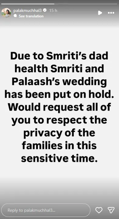 पलक ने पुष्टि की है कि उनके भाई पलाश मुच्छल और क्रिकेटर स्मृति मंधाना ने अपनी शादी कुछ समय के लिए स्थगित कर दी है. पलक ने लोगों से से प्राइवेसी की गुज़ारिश करते हुए इंस्टाग्राम पर बताया, 'स्मृति के पिता की हेल्थ की वजह से पलाश की शादी अभी रोक दी गई है. सभी से रिक्वेस्ट है कि इस मुश्किल के वक्त में फैमिली की प्राइवेसी की रिस्पेक्ट करें.'