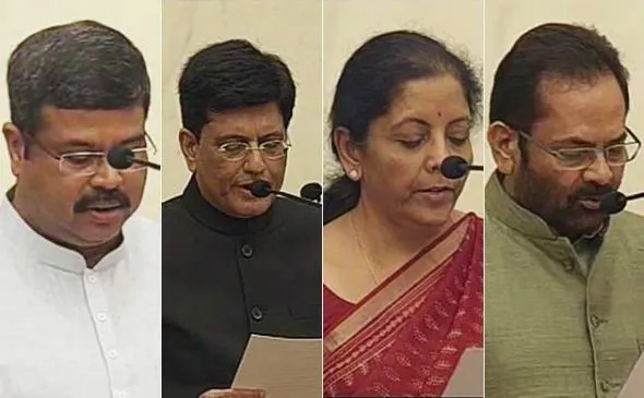 मुख़्तार अब्बास नक़वी, निर्मला सीतारमण, पीयूष गोयल और धर्मेंद्र प्रधान को मिला प्रमोशन, कैबिनेट मंत्री की ली शपथ।