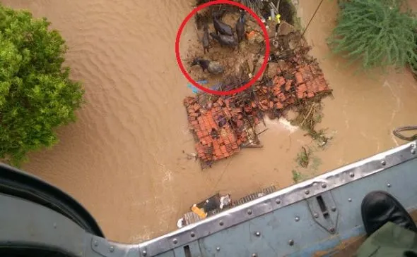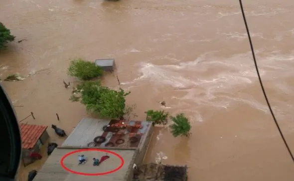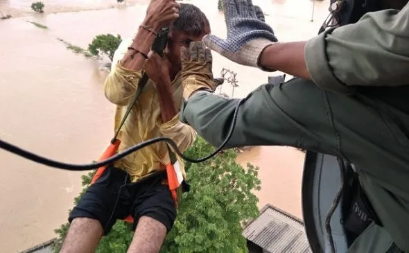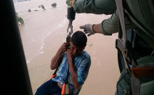 बाढ़ में फंसे लोगों को राहत दल ने हेलिकॉप्टर से बचाया। रस्सी के सहाने उन्हें ऊपर खींचा गया। क्षेत्र में अभी कई और लोगों के फंसे होने की संभावना है।