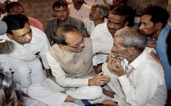 गोलीबारी में मरे किसानों के परिजनों से मिलते शिवराज सिंह चौहान